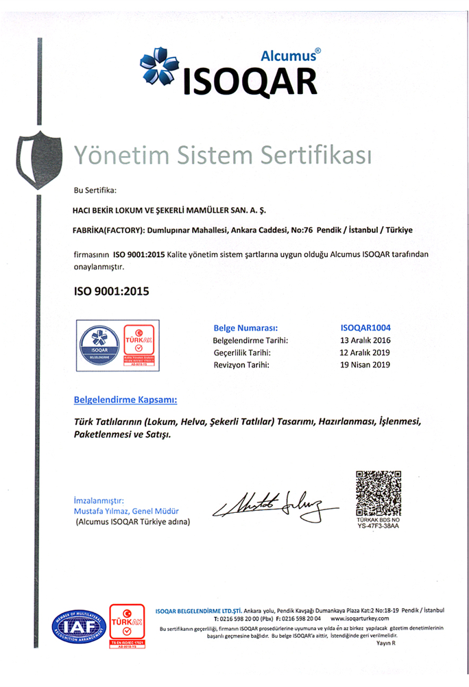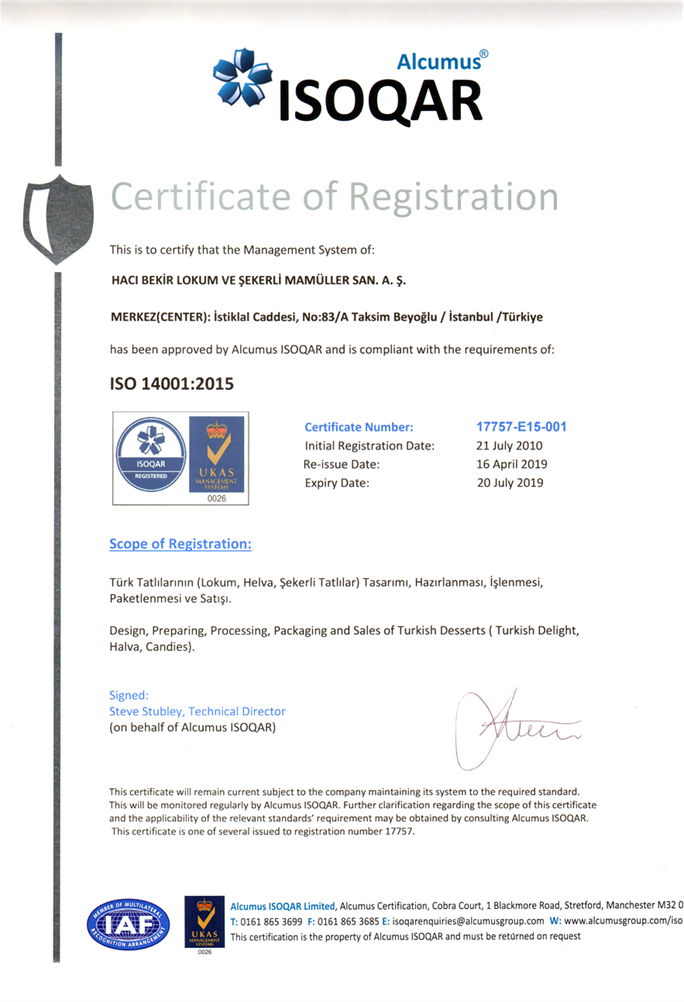 HACI BEKİR Firması, hedeflerini çalışan personelini eğiterek, tüm personelinin bilinçlenmesini sağlayacak ve Kalite, Çevre ve Gıda Güvenliği Politikasını sürekli gözden geçirecektir. HACI BEKİR Firması, bu politika ve hedeflerinin temiz çevre ve doğa içinde tahakkuk edeceğine inanarak bu hususları gerçekleştirmeyi ve geliştirmeyi taahhüt eder.