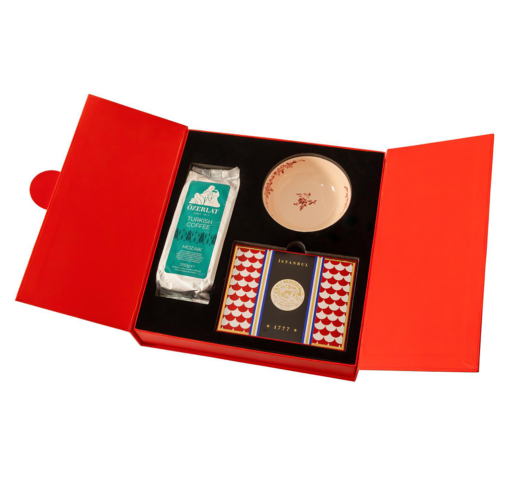- Ceramic Turkish delight holders; Designed by Chloris Seramik for Hacı Bekir, the Turkish delight holders were prepared by hand using classical methods. After the form was obtained from the mold and the first cooking was achieved, they were sorted one by one by hand; the pattern was worked with freehand drawing technique and cooked again at high temperature. All materials were selected to be compatible with cold and hot foods, and produced in limited numbers.